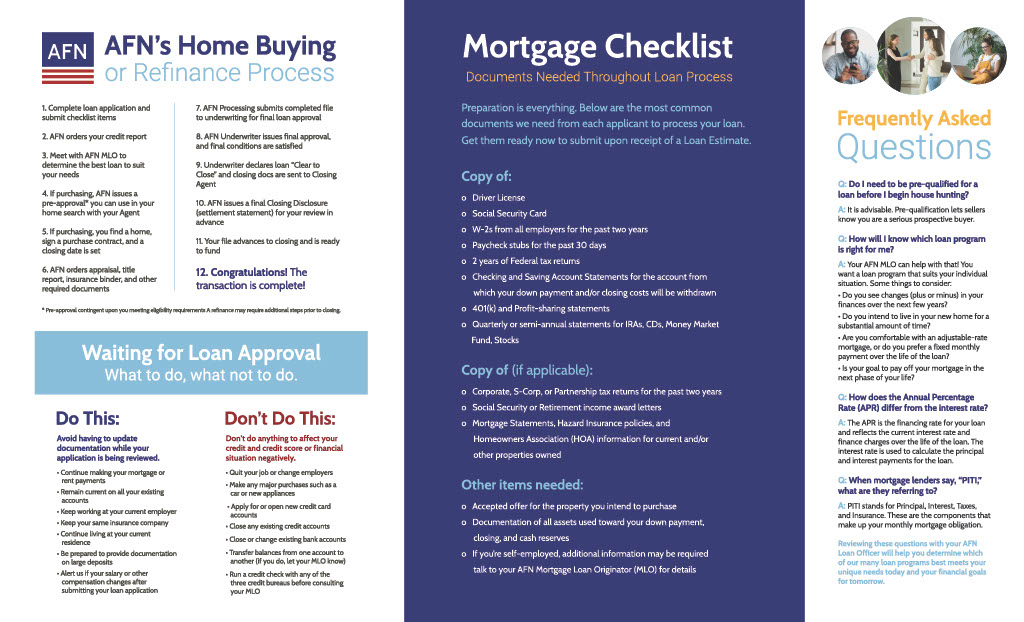 Don’t let new or potential borrowers walk away empty-handed. End your meeting with them by giving them vital information about the home buying process they want to know. This AFN themed, 14″ x 8.5″ brochure outlines exactly what they need to submit for you to fund that loan and what to expect from you. This all-around informational brochure is perfect for those buying for the first time. Includes a business card slot for convenient presentation.